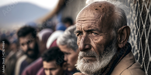 old, man, on, a, fence, border, or, locked, in, out, many, other, people, the, background, fictional, place, poverty, migration, flee, alone, crowd, rush, sad, helpless, help