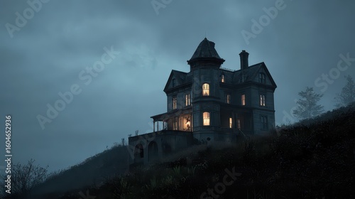 Old mansion on hilltop, lights on, foggy background. Storytelling, spooky imagery