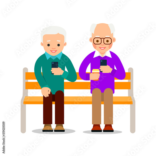 Old men with phone. Grandfather and elderly man are sitting on bench and smiling read messages in smartphone. Happy retirement. Cartoon illustration isolated on white background in flat style