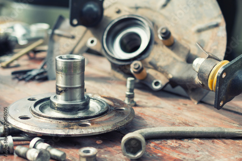 check, oiled, brake, bolt, part, disc, break, car, hub, removed, substitution, circle, metal, disc, rust-eaten, change, rim, screw, garage, maintenance, automotive, service, replace, detail, repair, round, bolt, table, wooden, tire, grease, spanner, lubrication, jack, steel, wrench, shiny, vehicle, wheel, suspension, axle, dusty, spare, cross, processed, retro, vintage, old