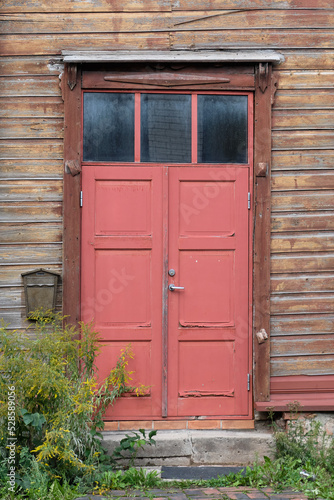 Old red wooden doors, entrance to wooden house with withered peeling paint on the walls. Tartu, Estonia. European historic architectural details.