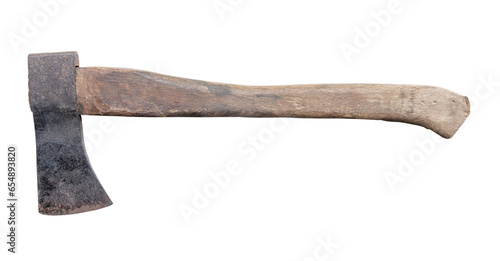 Old rust dirty dark gray axe with brown wooden handle isolated on white background with clipping path
