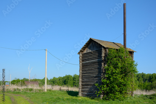 water tower, tower, water, water supply, building, wooden, timber, blockhouse, powerline, wire, pole, concrete, village, siberia, western, russia, travel, tour tourism, tree, grass, greener, summer, day, sky, blue, nobody