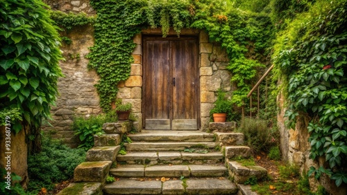 Old rustic wooden door with worn stone steps leading up to it, surrounded by lush greenery and vines, conveying a sense of aged tranquility.