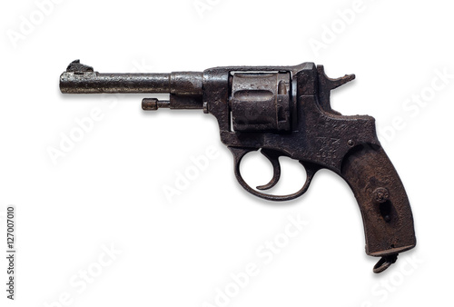 Old rusty revolver 1939 year. Isolated on white background.