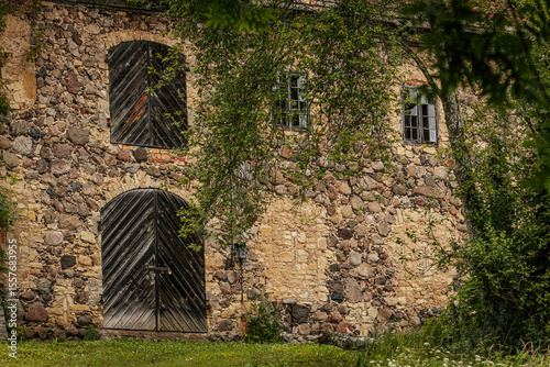 Old stone building with arched wooden doors, rustic windows, and lush greenery surrounding the facade on a summer day.