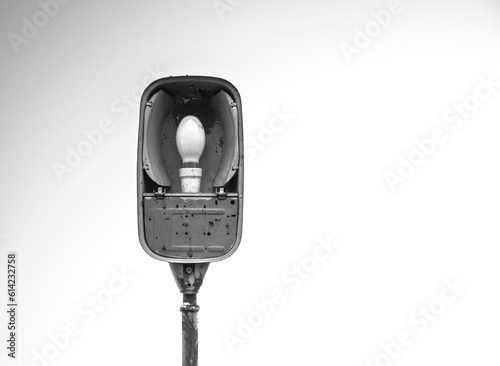 Old street lamp. Damaged street lighting. Lamppost during the day.