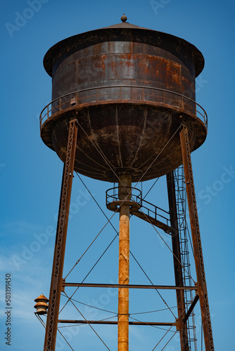 Old water tower isolated against a blue sky