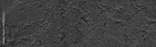 Old weathered black exterior wall wide panoramic texture. Cracked painted plaster. Dark gray grunge widescreen background