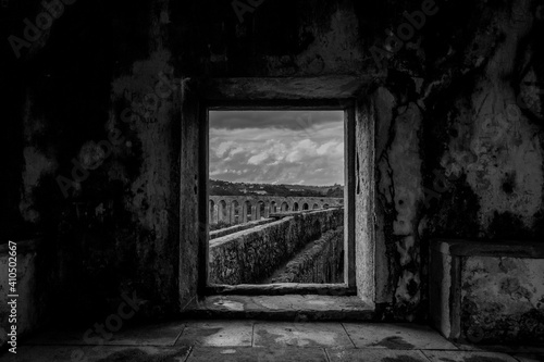 Old window view of the ancient aqueduct of Pegoes, wich supplied the convent of Christ in the templar city of Tomar, Portugal