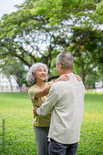 asian, people, person, adult, mature, aged, old, elder, grandparent, grandmother, grandfather, grandfather, grandmother, couple, married, retired, grey, hair, goggles, t-shirt, casual attire, relax, refresh, park, garden, outdoors, outside, green, grass, standing, activity, daytime, dancing, hug, joyful, smile, together, waltz, look, hold, hand, spouse, partner, wife, husband, male, female, nature, health