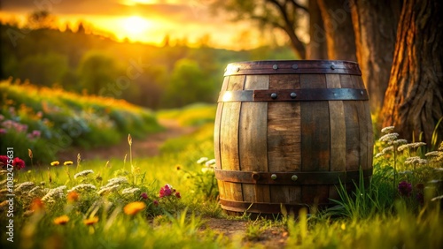 Old Wooden Barrel Surrounded by Colorful Flowers in a Rustic Landscape at Golden Hour, Capturing Nature's Serenity and Beauty