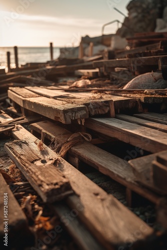 Old wooden pier on the beach at sunset. Selective focus. Toned.Generative Ai