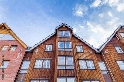 Old wooden warehouses along the harbor in the center of Tromso in northern Norway