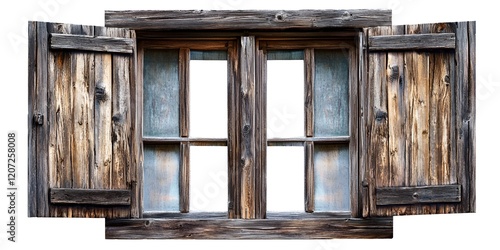 Old wooden window with open shutters, isolated on a white background. bokeh background