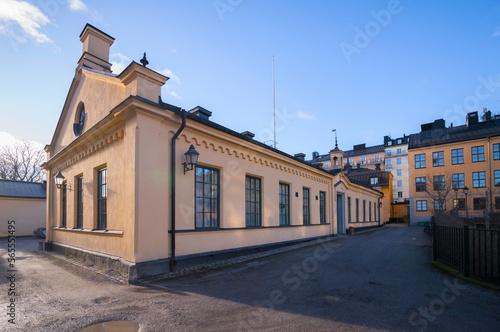 Old yellow 1850s houses at the block Kungliga Myntet, royal mint, facades, chimneys, and dorms a winter day in Stockholm