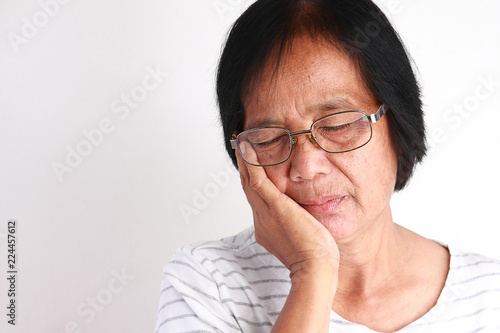 Older Asian women are sad because of toothache.