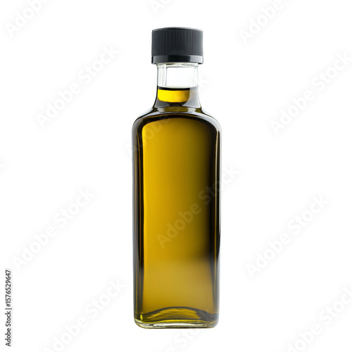 Olive oil in a transparent bottle isolated on white background or transparent PNG, showcasing golden-green liquid and sleek glass design