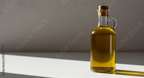 olive oil, glass bottle, cork, filling, containing, pouring, liquid, clear, table, surface, ingredient, product, food, drink, cooking, fresh, healthy, natural, still life, indoor, closeup, minimalist, shadow, light, illuminating, eating, favor, diet, nourishment, epicure, culinary, tabletop, studio, simple, presentation, copy space, advertising, marketing, commercial