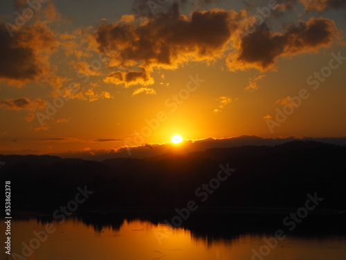 sunset, lake, sunset, landscape, lovely, lakeshore, water, sky, nature, cloud, sun, japan, tour tourism, heavenly, water surface, evening, fall, memory, reflex, mere, fantasy