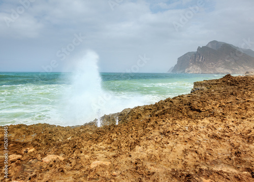 arabian, middle east, oman, blowhole, cloud, horizon, landscape, nature, ocean, outdoors, rock, scenic, sea, sky, spray, storm, surf, water, wave, weather