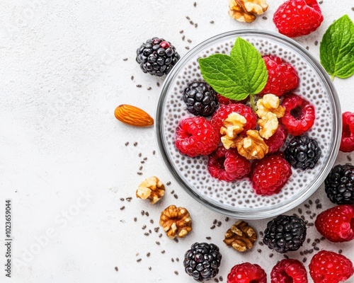 Omega-3 rich chia seed pudding topped with nuts and fresh berries, healthy breakfast, Omega-rich meal, nutritious breakfast