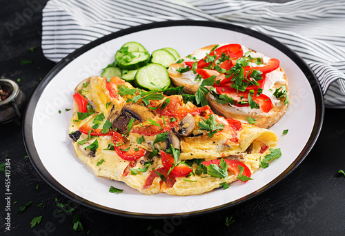 Omelette with mushrooms, paprika, tomatoes and sandwich with cream cheese on white plate. Frittata - italian omelet.