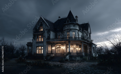 Ominously dilapidated and abandoned mansion with illuminated interior lighting at dusk under a cloudy sky. 3D rendering.