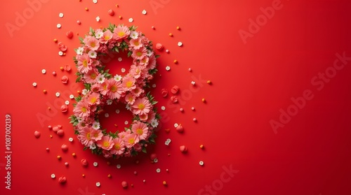 On a red background, the number 8 is laid out from flowers, decorated with flower petals. Stylish card with the number 8. Congratulatory background for March 8th.