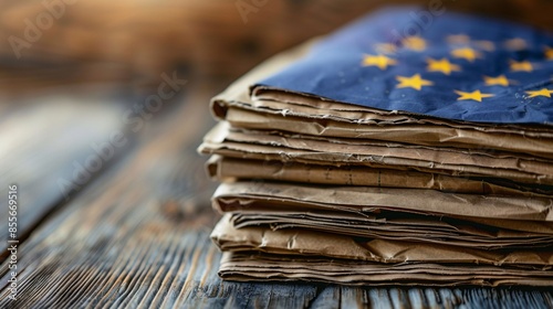 On a rustic wooden table, a pile of documents marked AI regulation showcases detailed EU laws and policies aimed at governing AI technology with safety and ethical considerations. The clean layout
