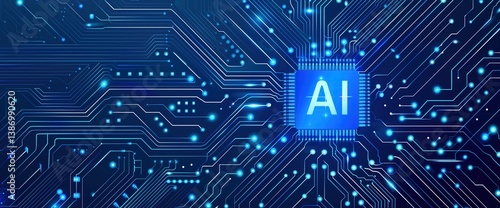 On the circuit board covered with orange and blue interwoven lines, the word "AI" is eye-catching in the center, full of cutting-edge technology.