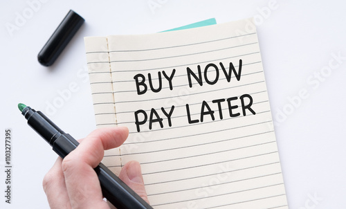 On the reports, notepads with the text BUY NOW PAY LATER. Business concept