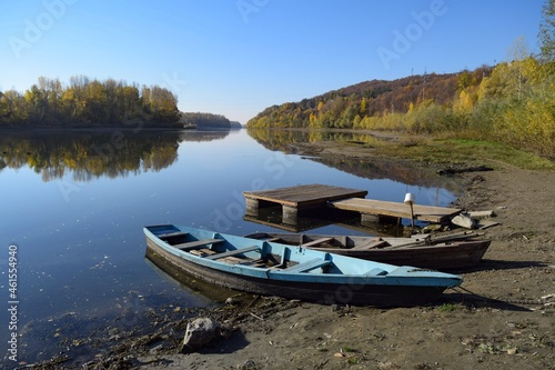 On the river bank near the pier there are two wooden boats against the background of the autumn forest