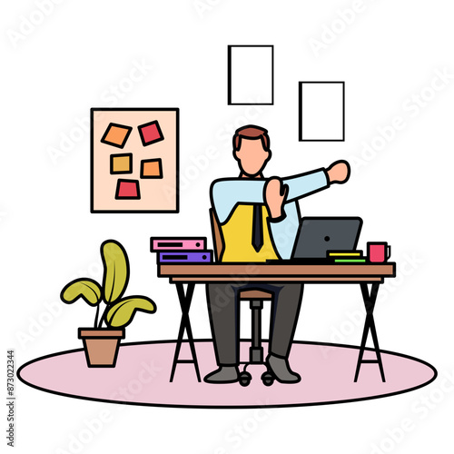 one arm desk stretch while office break concept, Stretching feels good vector color design, corporate wellbeing symbol, Sedentary lifestyle sign, self serving behaviors stock illustration