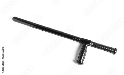One black police baton on white background, above view