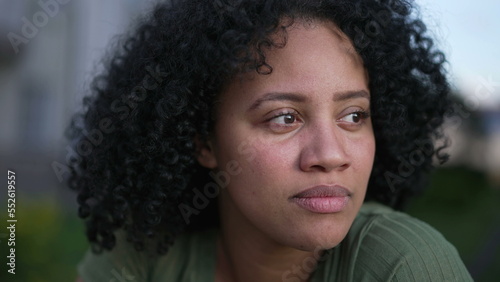 One contemplative young black woman closeup face. Pensive Brazilian adult girl stands outdoors in contemplation. Thoughtful South American female person