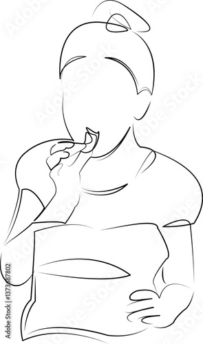 continuous, linear, line art, hand-drawn, outline, white background, drawn, image, snack, chips, person, portrait, childhood, eating, happy, food, potato, happiness, face, young, cute, girl, tasty, lunch, baby, eat, lifestyle, fun, little, unhealthy, healthy, meal