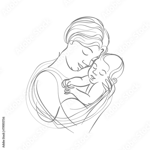 1, continuous, line, drawing, mother, holding, baby, black, colours, only