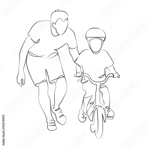 drawing, illustration, vignetting, line, graphic, design, outline, symbol, isolated, continuous, icon, art, concept, linear, signs, simplicity, abstract, hand, silhouette, contour, doodle, logotype, children, person, learning, son, boy, male, family, bicycle, teaching, man, adult, childhood, lifestyle, outdoors, cycling, smiling, fun, assistance, riding, care, bonding, togetherness, happiness
