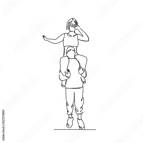 drawing, illustration, vignetting, line, graphic, design, outline, symbol, isolated, continuous, icon, art, concept, linear, signs, simplicity, abstract, hand, silhouette, contour, doodle, logotype, man, female, girl, shoulder, fun, male, children, adult, outdoors, daughter, father, horizontal, family, childhood, nature, summer, carrying, togetherness, color image, lifestyle