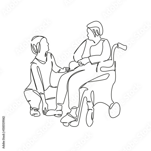 drawing, illustration, vignetting, line, graphic, design, outline, symbol, isolated, continuous, icon, art, concept, linear, signs, simplicity, abstract, hand, silhouette, contour, doodle, logotype, nurse, wheelchair, person, care, support, female, assistance, disability, retirement, adult, patient, indoor, old, doctor, senior, elderly, health care, health, nursing home, man, lifestyle, help, horizontal