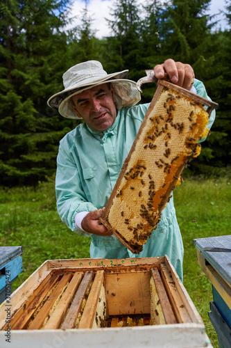 disabled, overall, protective, gear, protection, apiarist, man, mature, alone, single, person, people, honey, nature, rural, agriculture, field, farm, bee, apiary, natural, apiculture, yellow, blue, summer, hive, box, country, wooden, beehive, pollination, season, nectar, green, countryside, colourful, food, healthy, production, business, pollen, outdoors, honey bee, crate, farming, harvest