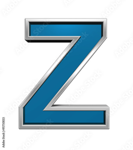 One letter from blue glass with chrome frame alphabet set, isolated on white. Computer generated 3D photo rendering.