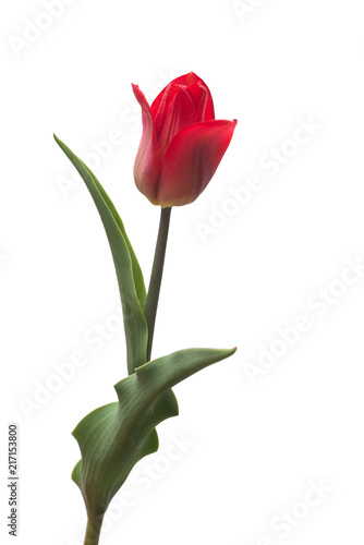 One red tulip flower isolated on white background. Still life, wedding. Flat lay, top view