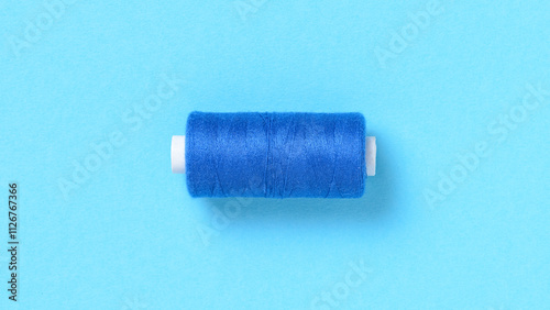 One single blue thread spool close-up flat lay top view with copy space for text