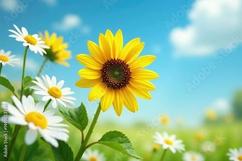 One vibrant yellow sunflower among white daisies, flower power, macro