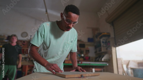 One young black carpenter using machine to trim piece of wood at workshop. Focused employee of carpentry business working meticulously