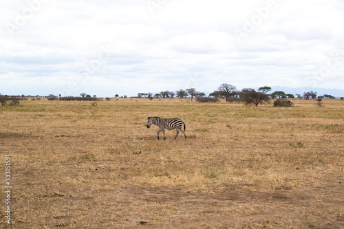 One zebra walking on the yellow grass of the savannah of Tarangire National Park, in Tanzania