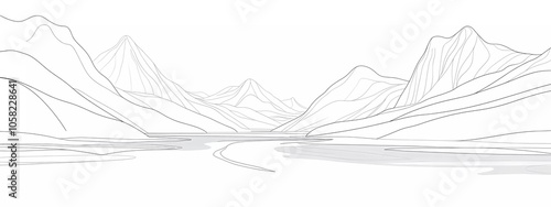 One-line drawing of mountains and a river, with simple black lines on a white background