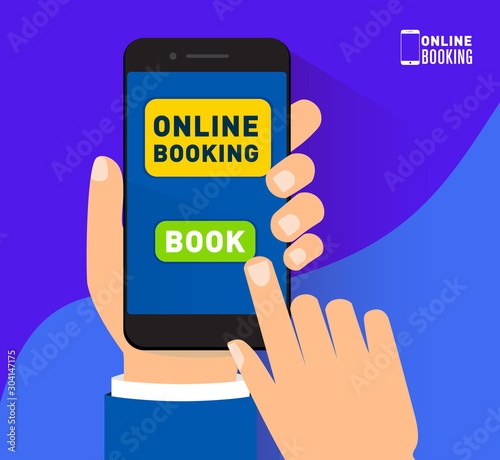online booking mobile application concept, hand holding smartphone with book button on screen, vector illustration